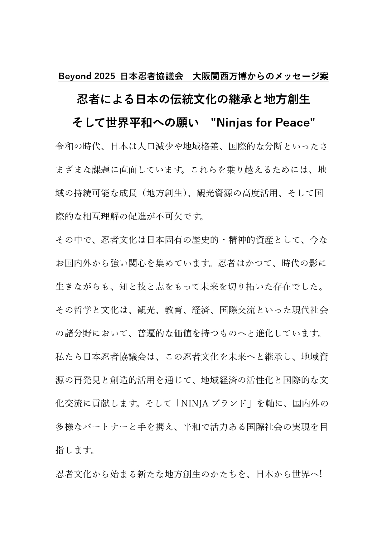 概要:忍者文化を通じた国際メッセージの発信と「忍」の理念による未来ビジョンの共有